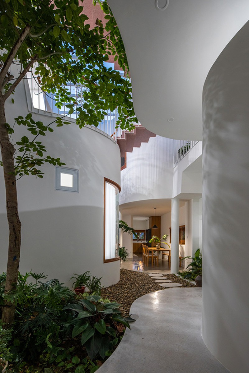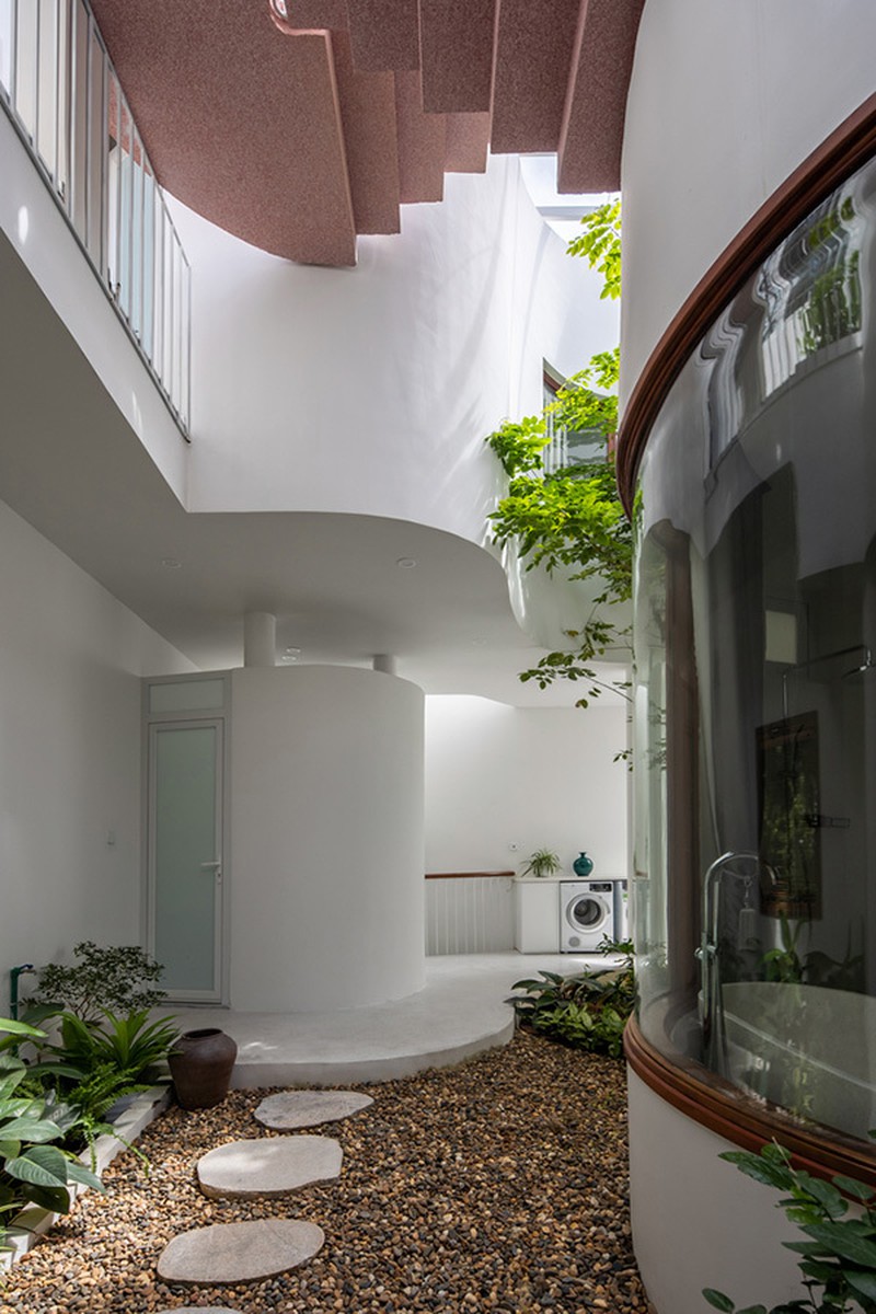 Bên trong không gian lõi uốn lượn của biệt thự là "lá phổi" với nhiều mảng xanh.