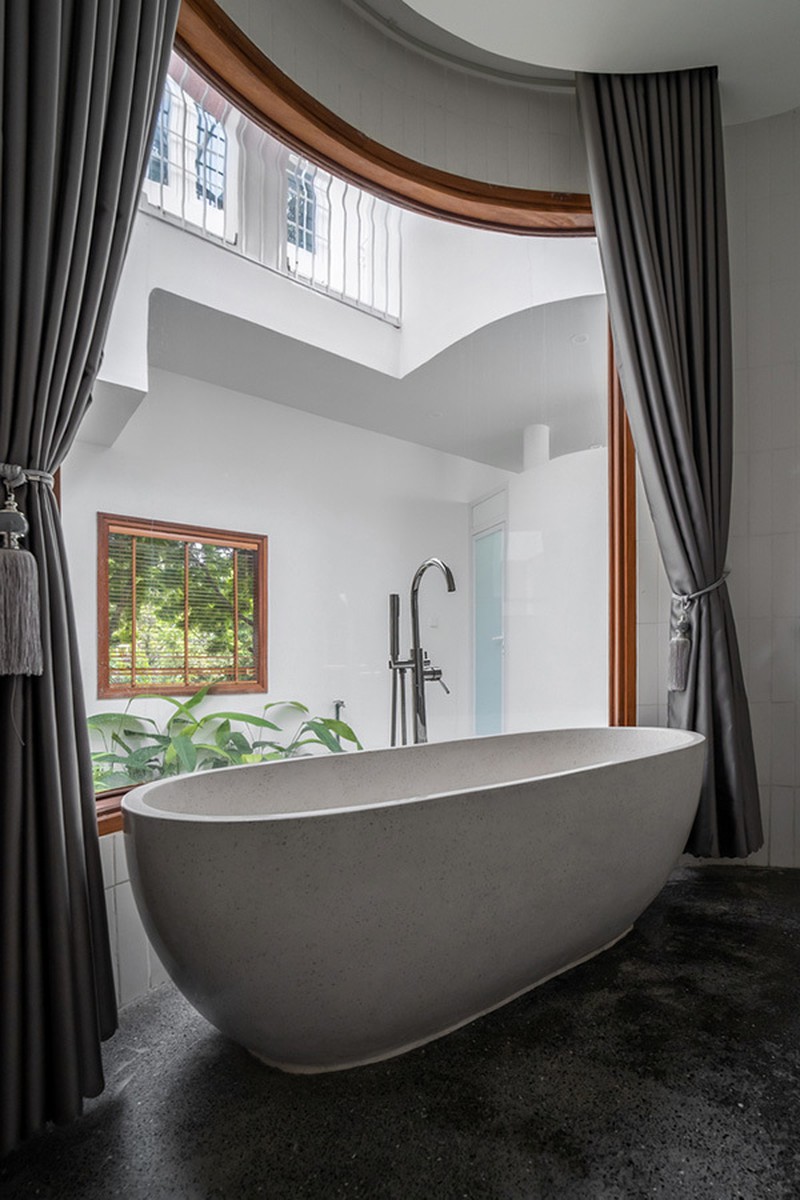 Phòng tắm có view hướng ra sân vườn.