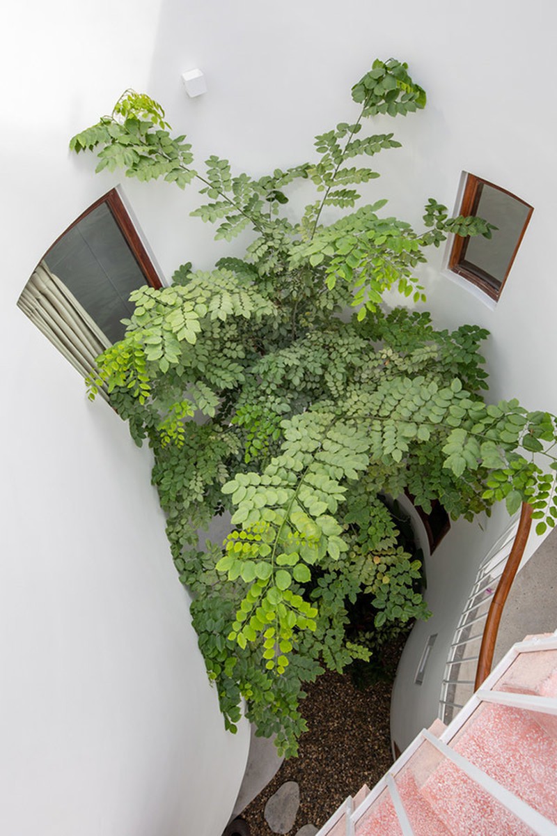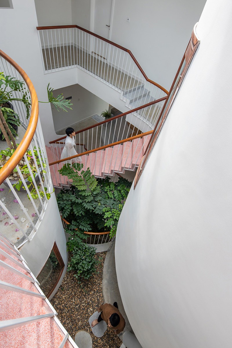 Bên trong là không gian lõi uốn lượn tạo cảm giác ngắm cảnh thú vị cho các thành viên trong nhà. Phần rỗng còn là “lá phổi” của ngôi nhà, nơi tập trung ánh sáng tự nhiên, gió và cây xanh.