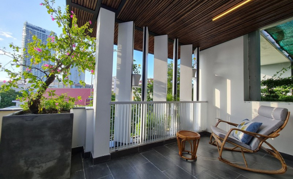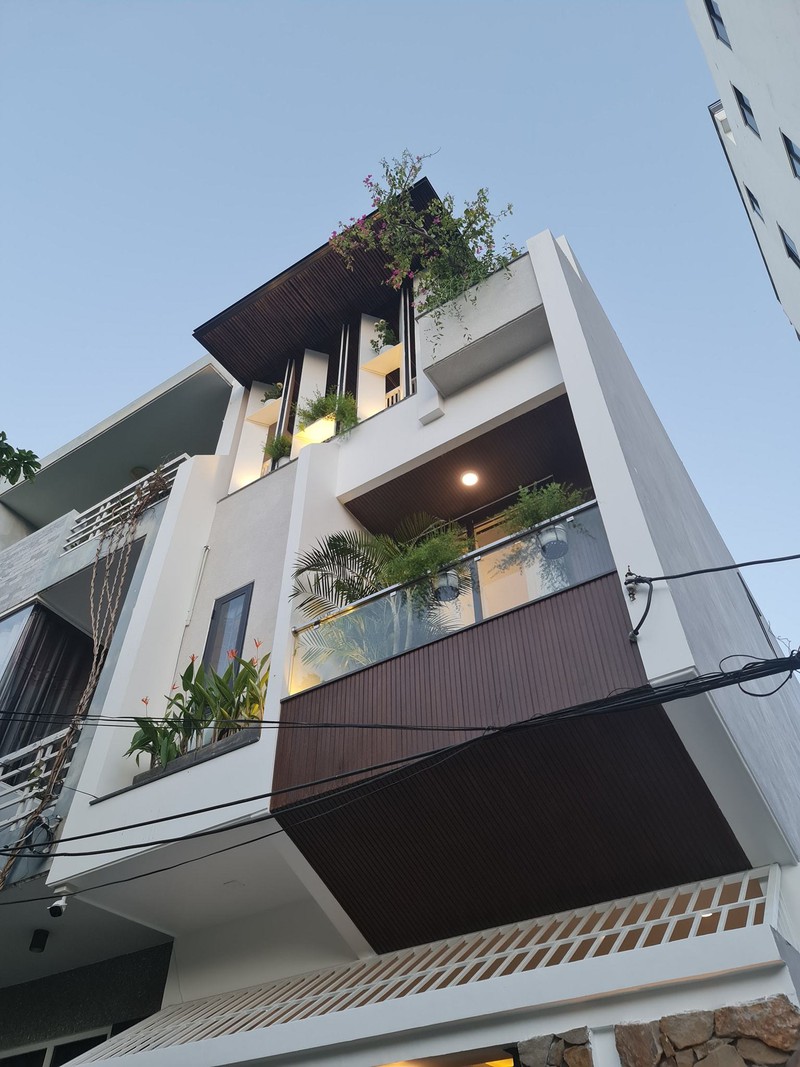 Mặt tiền bố trí các cột, tường, lam gỗ cản nắng.