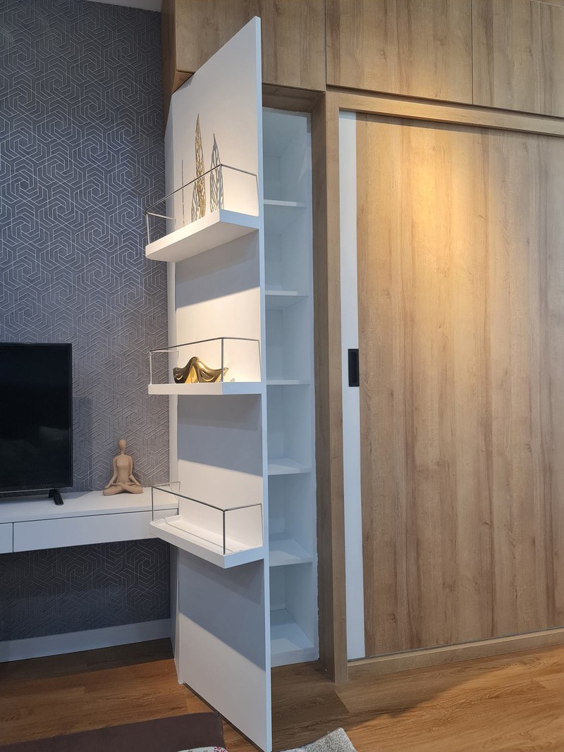 Gia chủ sử dụng gam màu trung tính, cho không gian nhà dễ chịu, thoáng đãng. Phần tường dùng giấy dán họa tiết thay vì sơn.