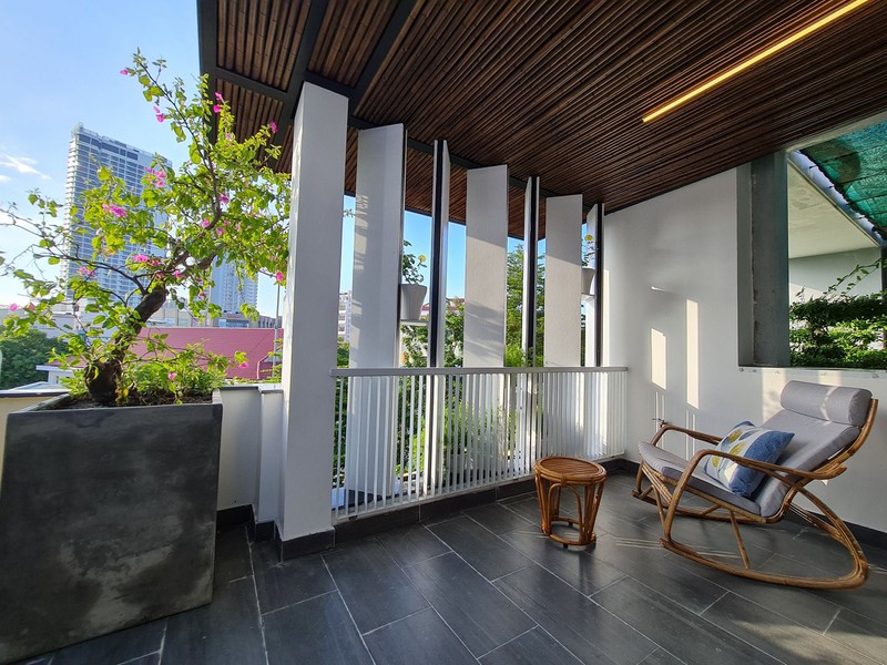 Phần mái sân thượng lợp tôn thay vì làm mái kính, sau đó ốp trúc đã xử lý chống ẩm và phun PU ở mặt dưới. Như vậy, vừa giúp giảm nhiệt, tăng tính thẩm mỹ và giảm được chi phí. Với cách bố trí đó, sân thượng luôn mát mẻ, có chỗ uống trà chiều khá lãng mạn.