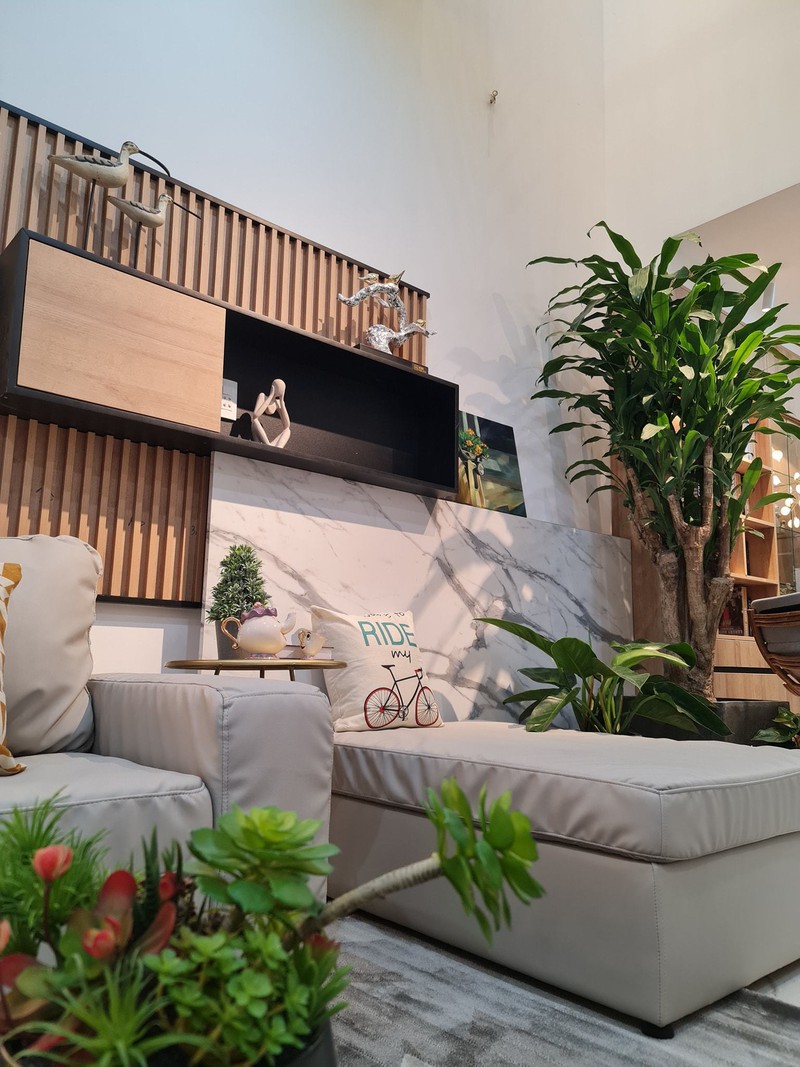 Phòng khách sinh động với hệ thống cây xanh xung quanh.