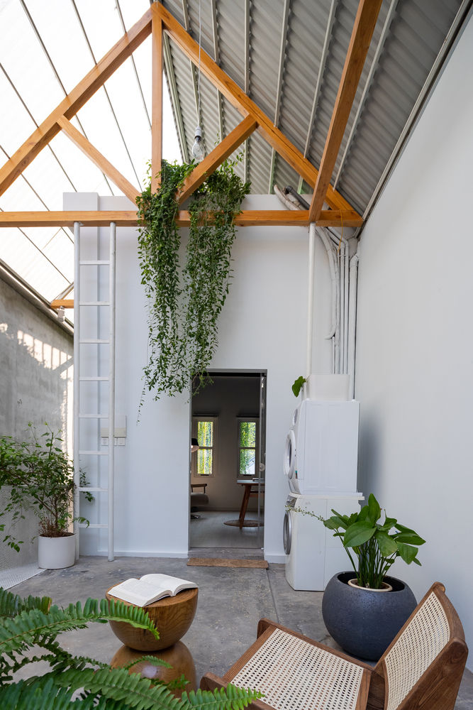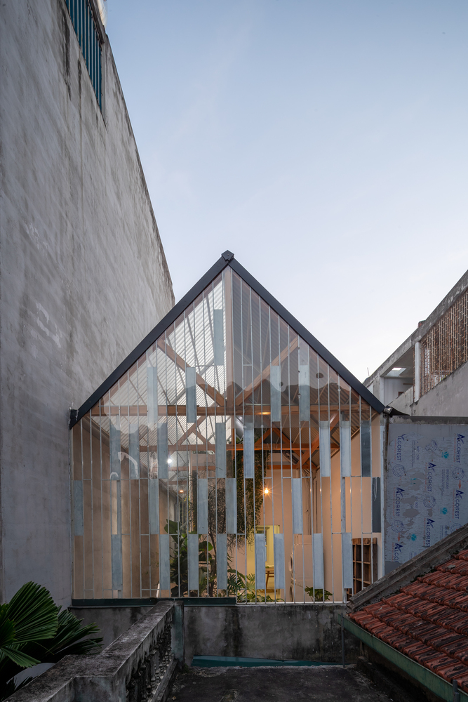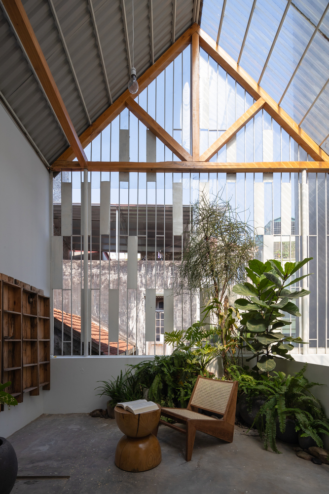 Một nửa mái chéo được làm từ tấm lợp trong suốt để lấy ánh sáng cho các khoảng xanh và tạo cảm giác không gian được mở rộng.