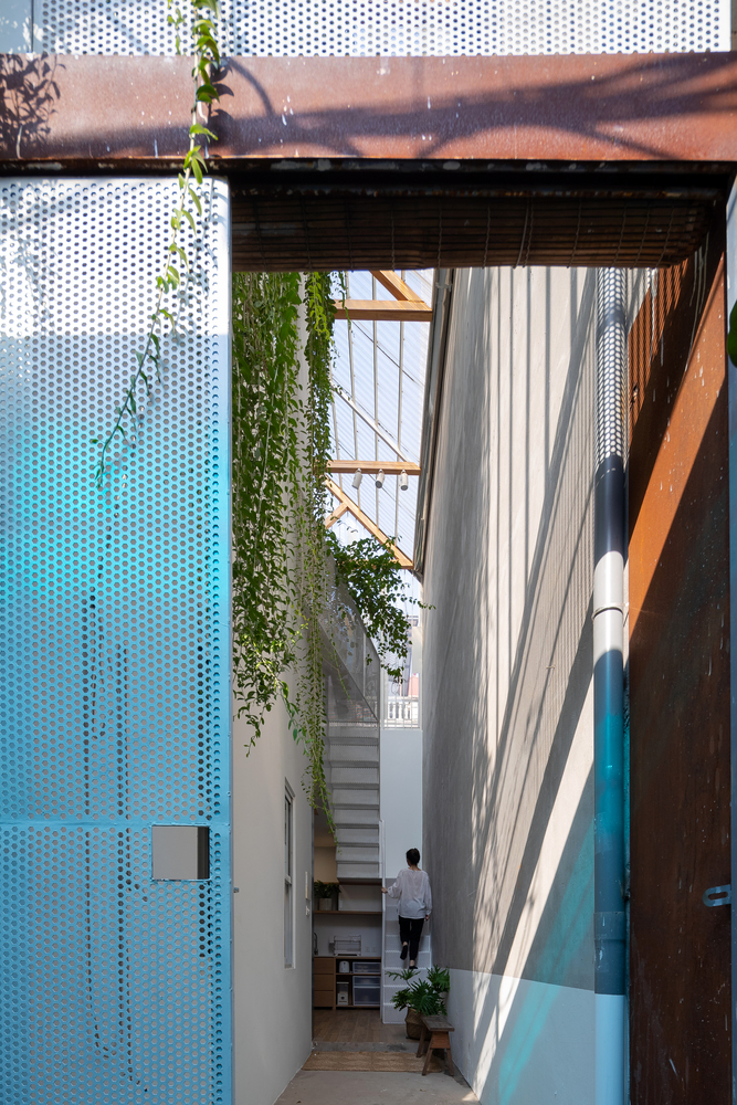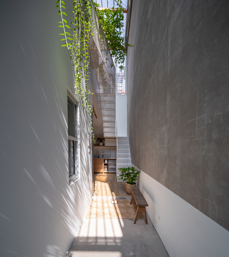 Bằng cách sử dụng cầu thang sắt đục lỗ kết nối tầng 1 và tầng 2, ánh sáng tự nhiên có thể tràn vào bên trong nhà bếp vào ban ngày.