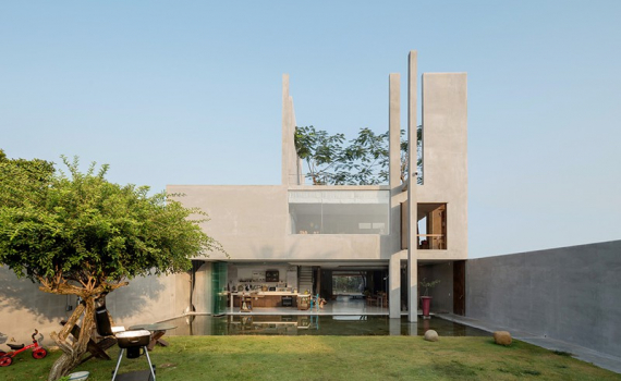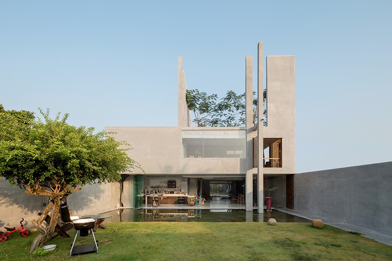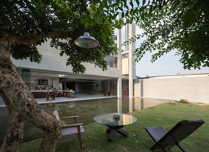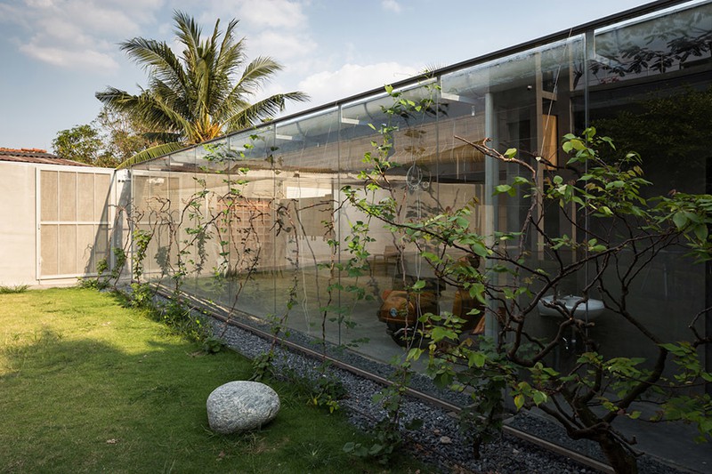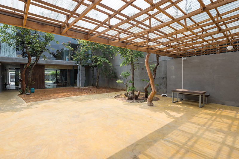 Kiến trúc sư đặt ngôi nhà chính gần như ở trung tâm của lô đất. Mặt tiền hướng ra phố được trồng cây ăn quả địa phương. Với không khí trong lành và hướng Đông Nam, kiến trúc sư dành ra một bãi cỏ trống lớn làm không gian đệm, nó không chỉ phục vụ sinh hoạt bên ngoài mà còn kết nối không gian làm việc của gia đình với nhà chính.