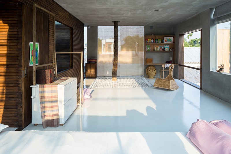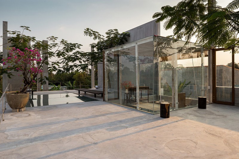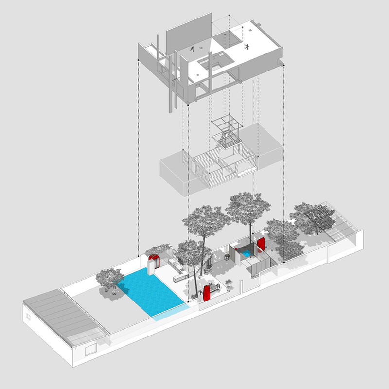 Tại ngôi nhà chính, kiến trúc sư tổ chức các không gian riêng tư như phòng ngủ và không gian sinh hoạt của gia đình thành một khối hộp, được nâng lên khỏi mặt đất. Bằng cách này, tầng đầu tiên được giải phóng, có tầm nhìn thoáng ra các không gian dọc theo ngôi nhà, trong đó bàn ăn sẽ là trung tâm của sinh hoạt ở tầng một.