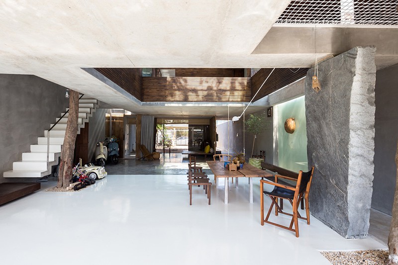 Nhà bếp, các không gian đa chức năng, bãi cỏ, sân, ao, ... được đan xen. Các cột bê tông ở trung tâm của ngôi nhà được thay thế bằng các cột đá. Để tăng cường sự kết nối giữa các tầng, kiến trúc sư còn trồng các cây cao xuyên các tầng. Tán cây trên đỉnh có thể giảm bớt ánh nắng chiếu trực tiếp vào mái nhà hoặc trần nhà, nó còn tạo nên một “công viên” thu nhỏ trên mái nhà.