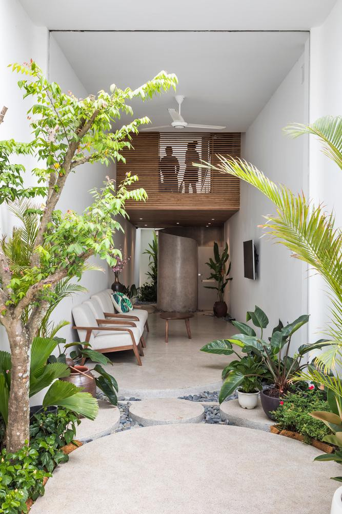 Cây xanh được bố trí xen lẫn giữa các cốt lệch tầng để không gian không bị quá khô cứng và nặng nề.