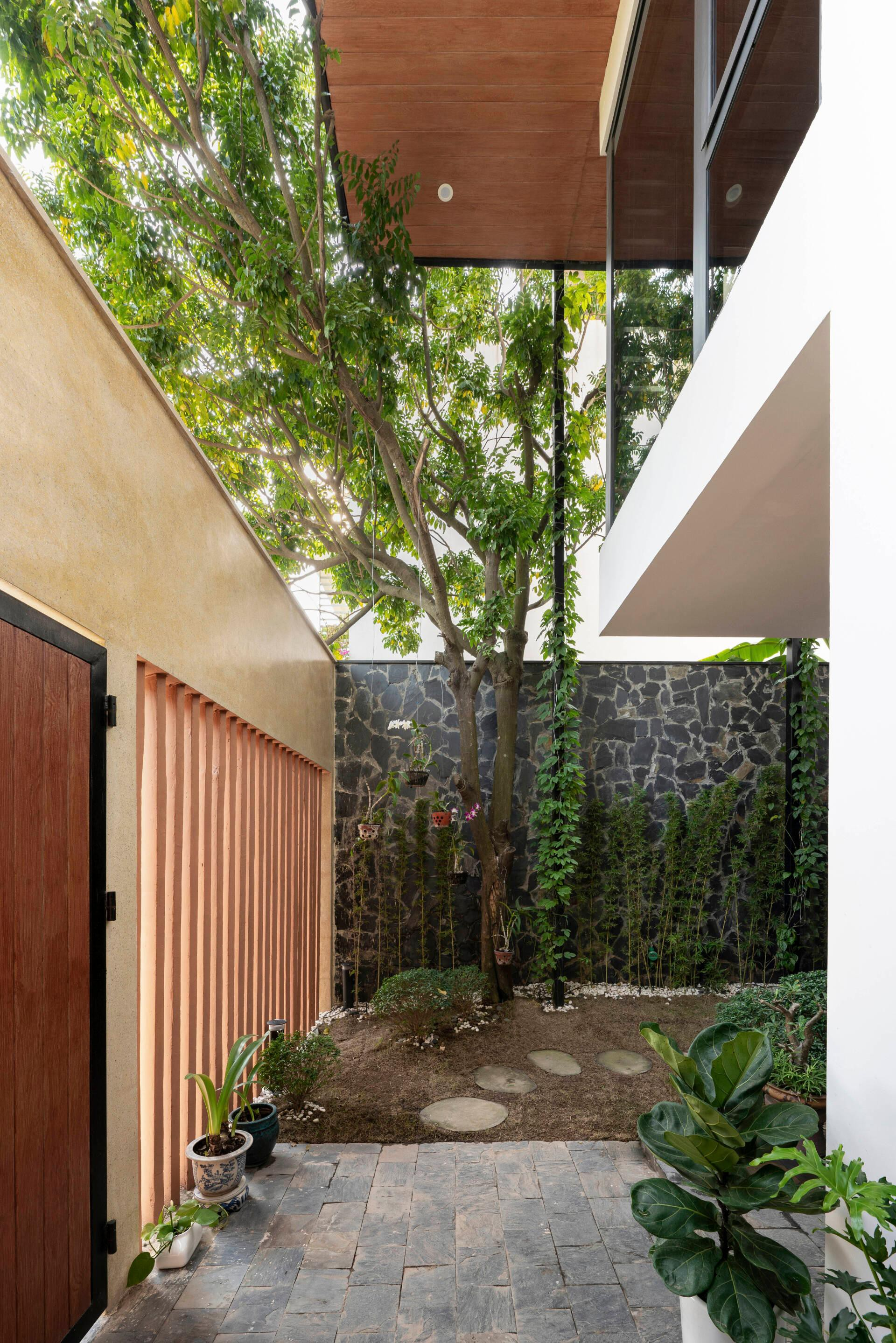 Sân vườn chạy dọc theo chiều dài của ngôi nhà trồng trúc cảnh và một số cây dây leo, khu vực này cũng có tác dụng thông gió cho ngôi nhà.