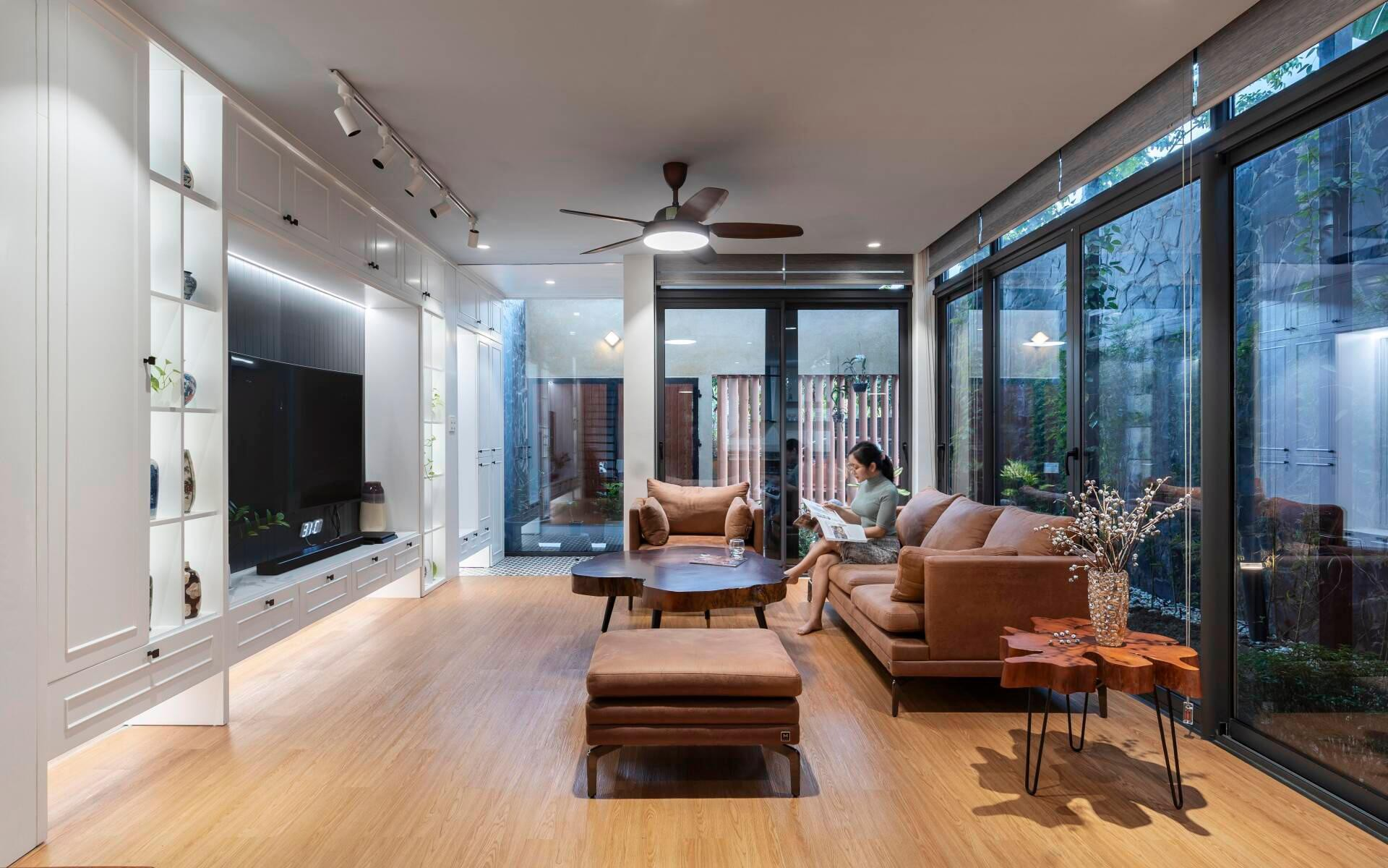 Nhờ các tấm cửa kính cỡ lớn mà phòng khách luôn tràn ngập ánh sáng từ sân vườn.