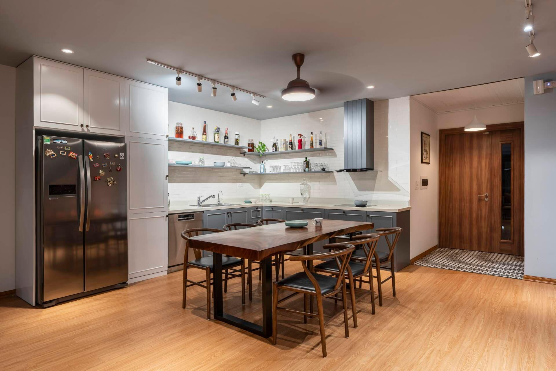 Phòng bếp - ăn rộng thoáng với hệ tủ bếp màu xanh - trắng, đem đến nhiều cảm hứng nấu nướng cho gia chủ.