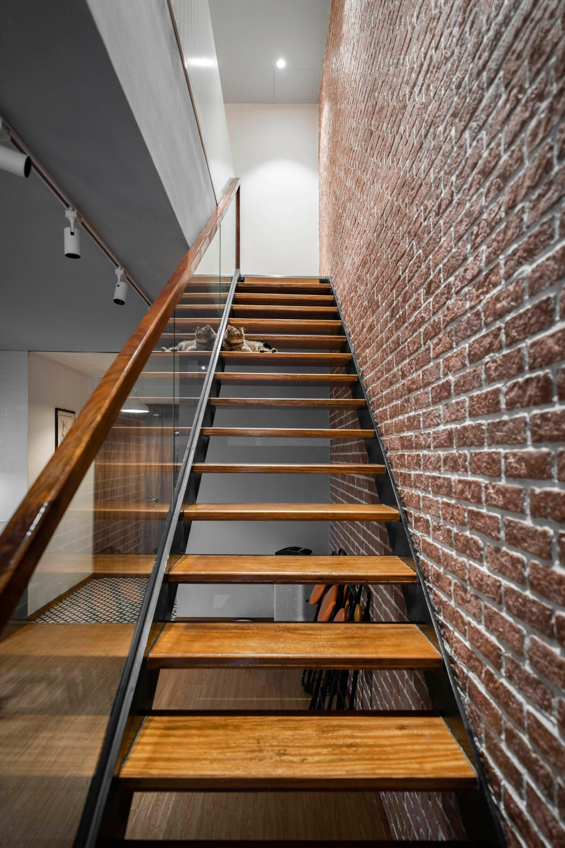 Ở tầng 1 còn có phòng ngủ cho người lớn tuổi. Cầu thang dẫn lên tầng 2 được đẩy sát vào 1 bên tường để tăng diện tích và công năng sử dụng. Hành lang cầu thang tầng 2 còn được tận dụng làm kệ để sách của gia đình.