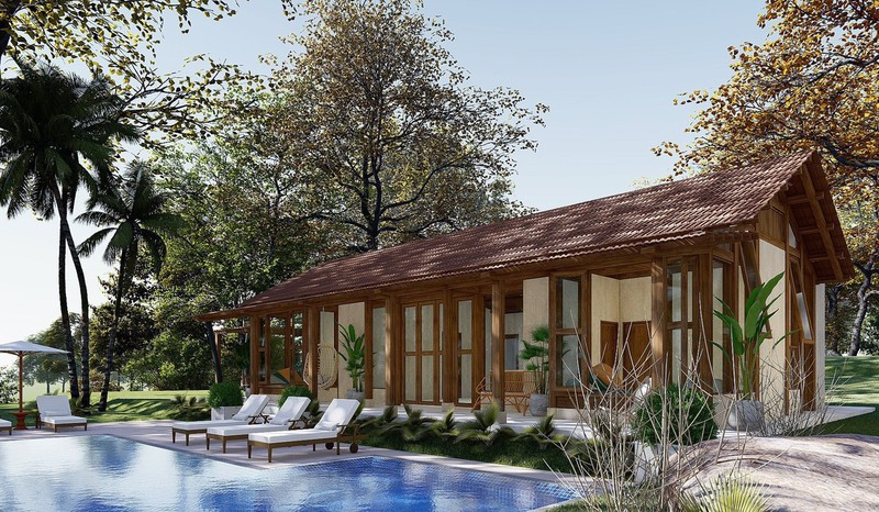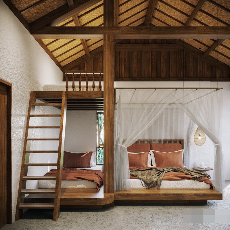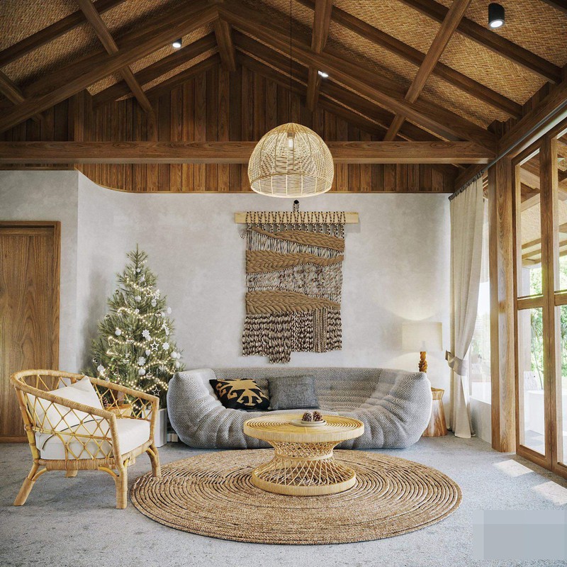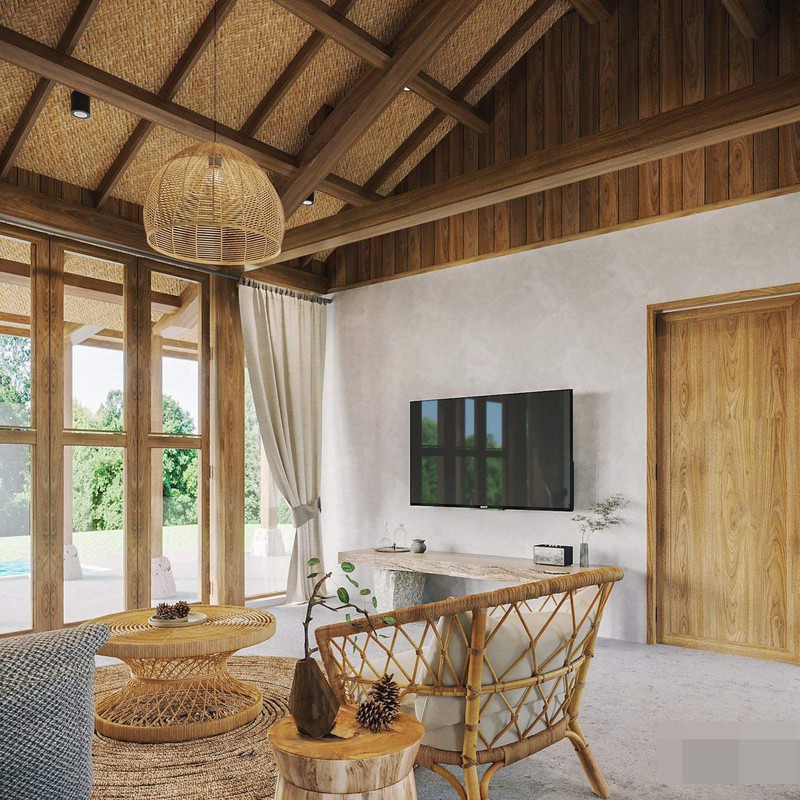 Vật liệu sử dụng các loại gỗ thịt, bê-tông mài, trần cót ép, đồ mây tre đan, granito cho sàn… làm không gian đơn giản, mộc mạc nhưng tiện nghi đủ đầy cho mỗi căn nhà.