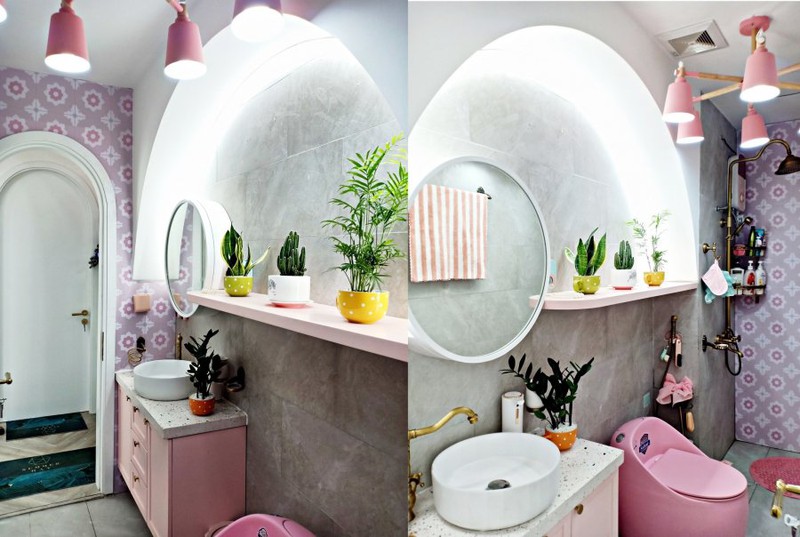 Điều thú vị đầu tiên ở căn hộ này là phòng vệ sinh dùng toàn nội thất màu hồng. Chẳng hạn như đèn trần, màu tường, máy nước nóng, kệ để đồ, tủ lavabo, bồn cầu.