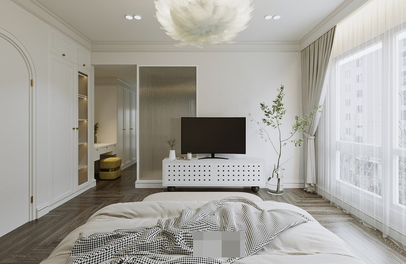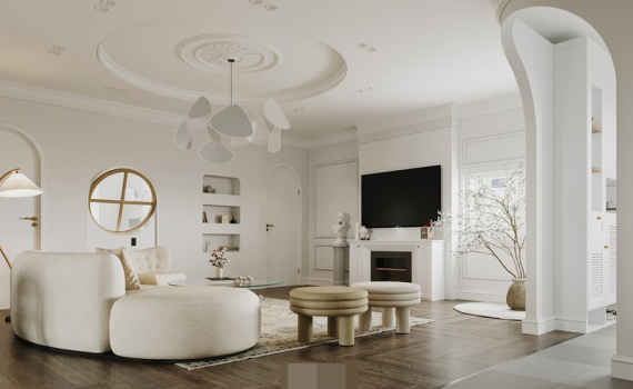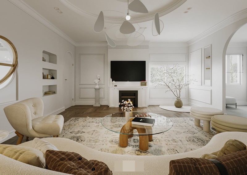 Lấy phong cách hiện đại mang tinh thần tươi trẻ làm chủ đạo, kiến trúc sư đã chọn cho căn hộ tone màu be trắng, nhấn nhá chút tinh tế thông qua chi tiết phào chỉ, vòm cửa phong cách cổ điển và những món đồ nội thất bo cong đặc trưng của phong cách curvy.