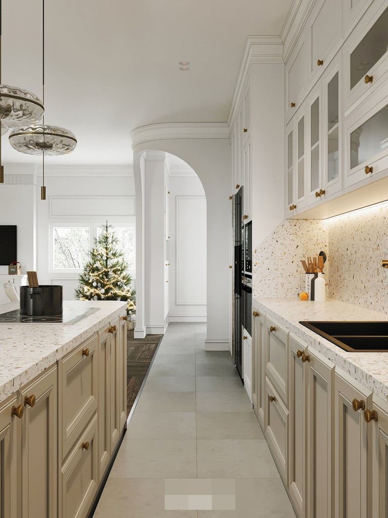 Khu vực bếp và đảo bếp nhìn thẳng tới khung vòm cửa bo cong nối sảnh với phòng khách.