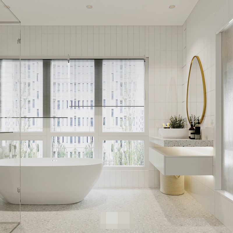 Phòng tắm được thiết kế tối giản với điểm nhấn là chiếc gương mạ đồng mang đến vẻ đẹp sang trọng, tao nhã.