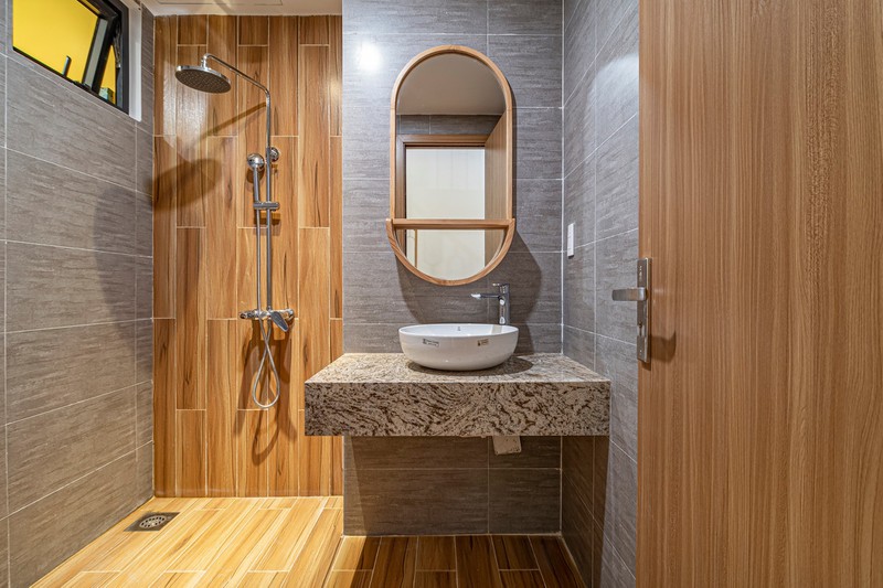 Các không gian sinh hoạt chính và phụ đều dùng gam màu gỗ vàng cho nhà thêm ấm cúng. Phòng vệ sinh, chị Dung ốp gạch giả gỗ cùng tông màu nội thất để đảm bảo sự bền vững, không bị mối mọt hay ẩm mốc.