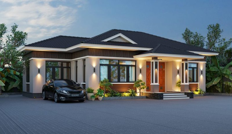 Mẫu thiết kế này đơn giản, tinh tế, có sự kết hợp giữa nhiều chất liệu như đá, kính, gỗ, tạo nét đẹp sang trọng. Mái thái với độ dốc thấp, mở rộng về các phía, mang đến cảm giác thanh thoát, nhẹ nhàng