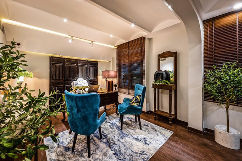Phòng làm việc pha trộn nét cổ điển và hiện đại nhưng vẫn bật lên phong cách chủ đạo là Indochine nhờ mảng lam gỗ phía sau ghế ngồi và bàn.