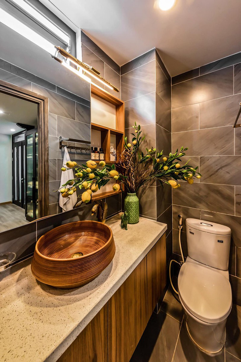 Phòng tắm đẹp "phát hờn", vòi bằng đồng, bệ rửa mặt gốm nghệ thuật và màu gạch trầm. "Tôi rất yêu không gian nhà đẹp của mình. Chúng giúp tôi tái tạo năng lượng mới, yêu đời và tràn đầy sinh khí", anh Quý tâm sự.