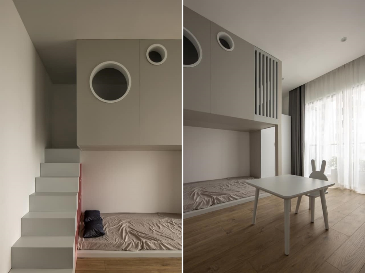 Với phòng bé gái lớn, vợ chồng chủ nhà cùng kiến trúc sư bố trí giường tầng. Ngoài chức năng phục vụ nghỉ ngơi, nó là nơi chơi đùa, đọc sách.