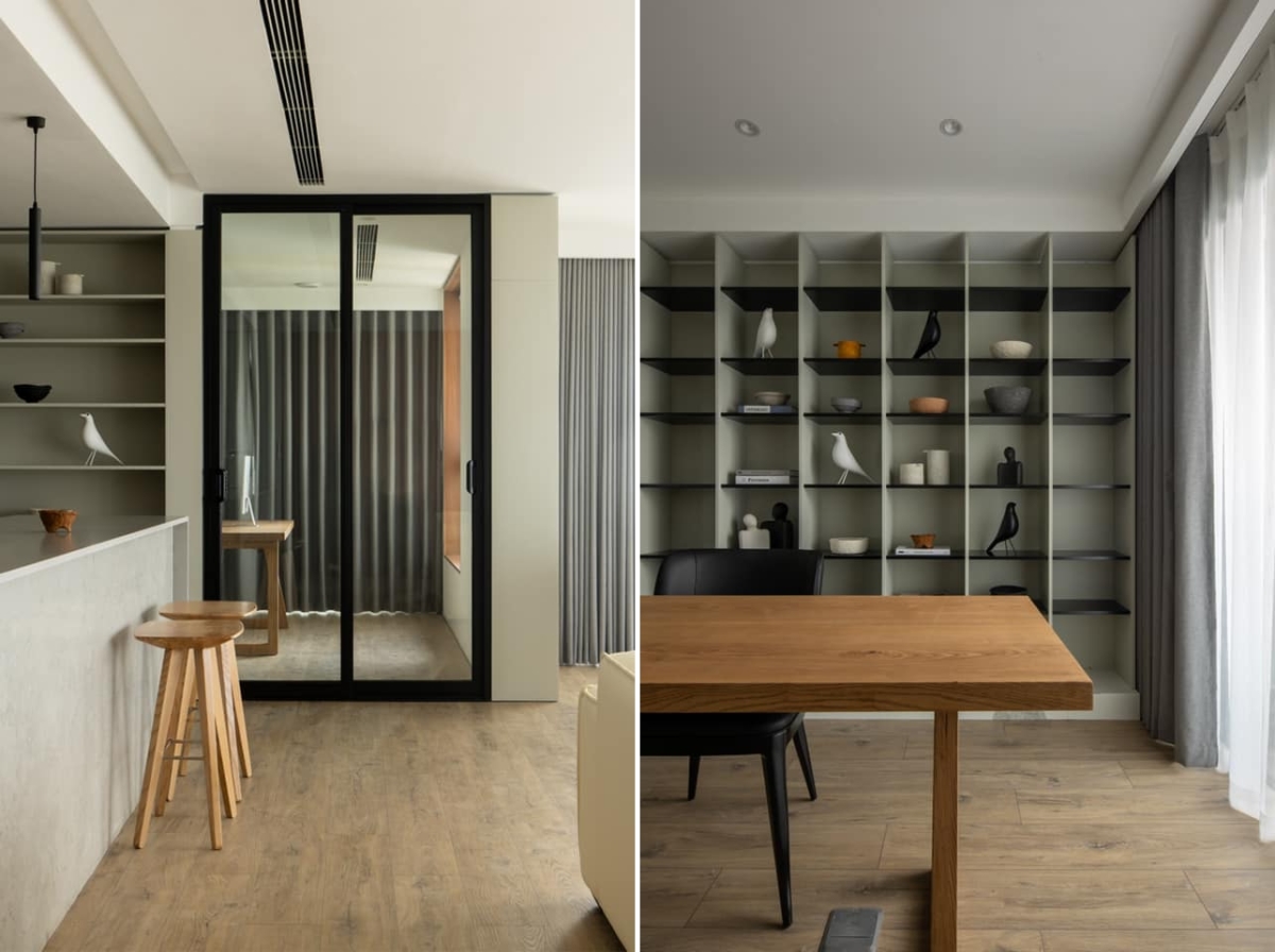 Cánh cửa "hòa lẫn" với chất liệu ốp tường để tạo nên không gian liên tục.