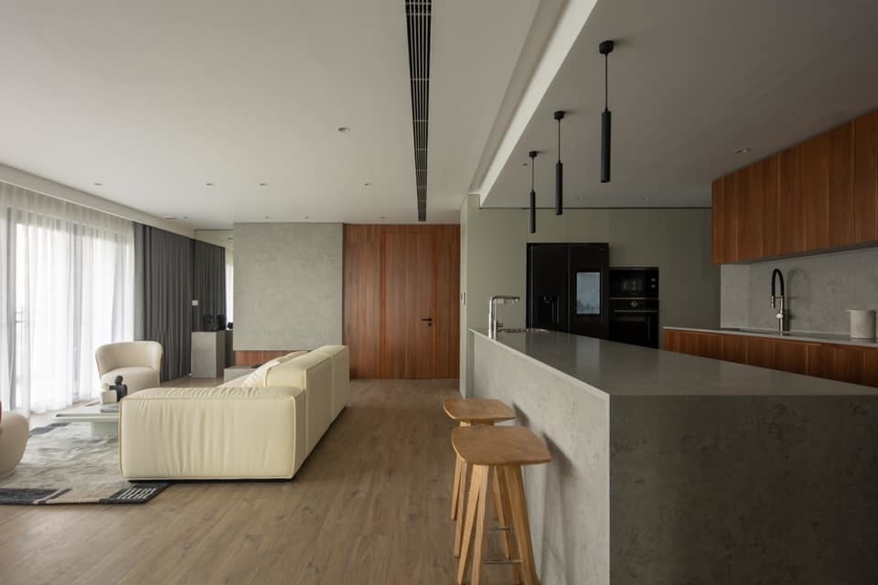 Căn hộ rộng hơn 210 m2 được bàn giao thô và thi công cải tạo trong hai tháng. "Bình thường không hợp được cái gì" song đến khi làm nhà, hai vợ chồng gia chủ thống nhất phong cách tối giản, hiện đại nhưng có nét phá cách riêng.
