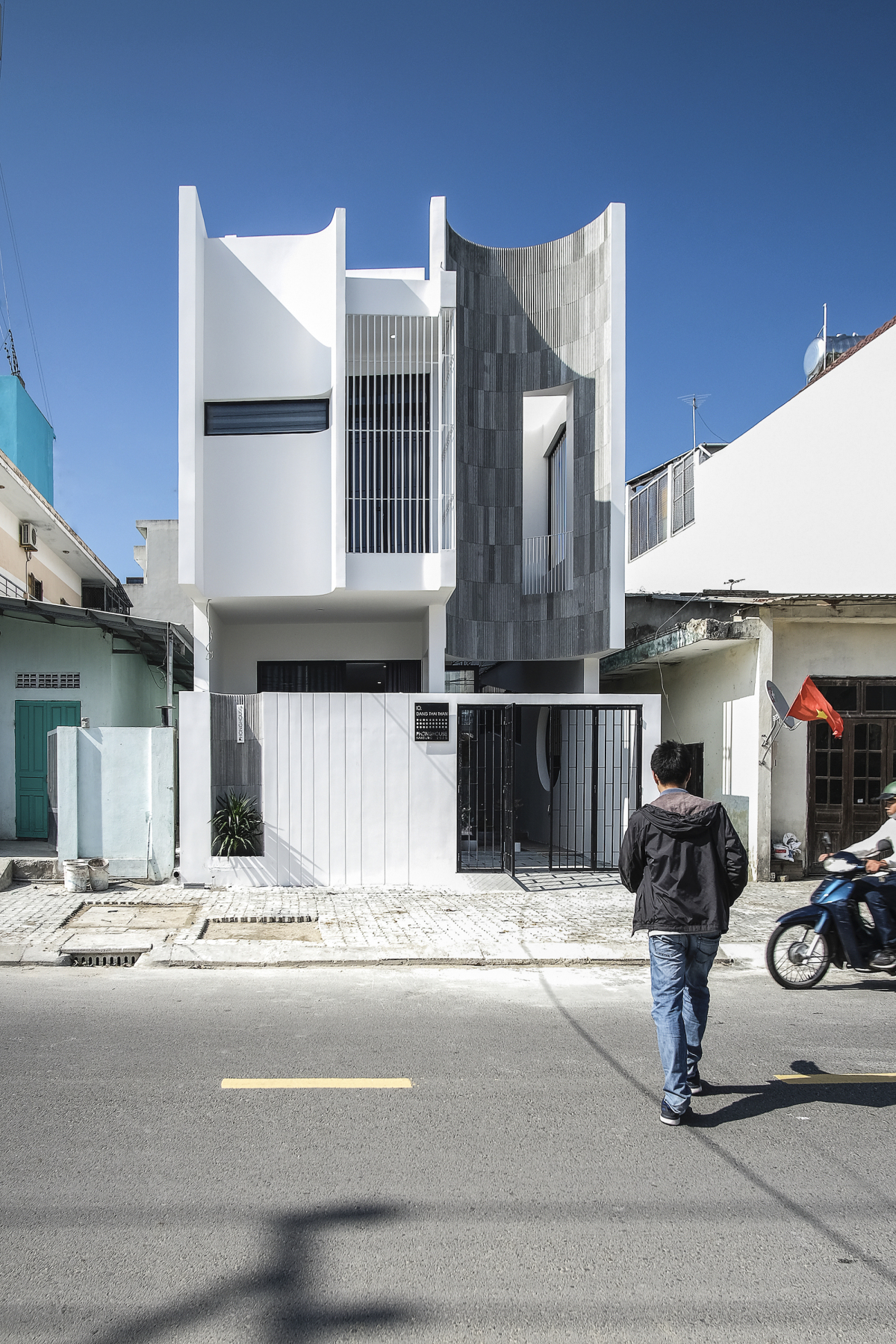 Mặt tiền nhà có hình bán nguyệt, ốp gạch bê tông xám. Giải pháp này tạo điểm nhấn cho công trình và khiến người nhìn bớt chú ý đến cảm giác thóp hậu của địa thế.