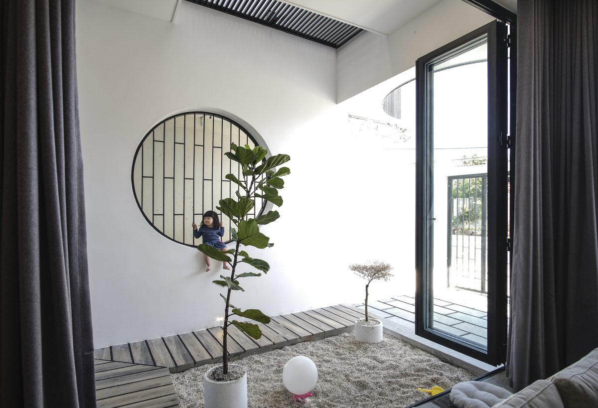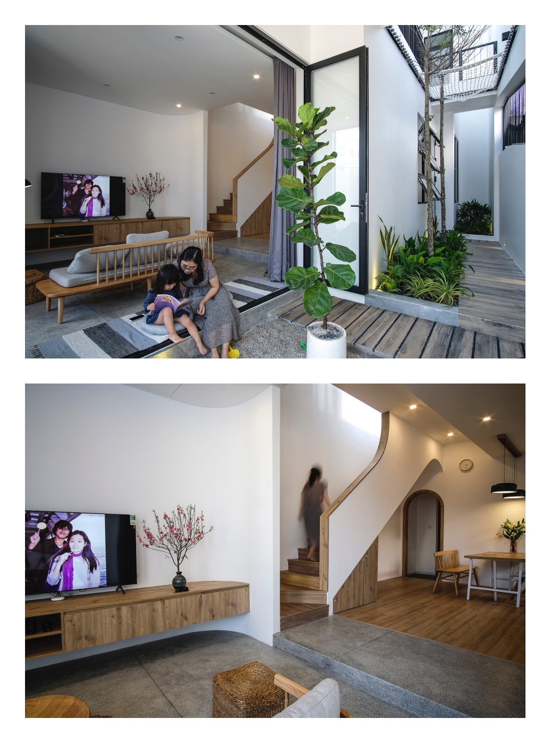 Bên cạnh đó, sân vườn là một phần quan trọng của căn nhà để đáp ứng tiêu chí tươi sáng, thông thoáng, tận dụng ánh sáng thiên nhiên từ trước ra sau cũng như thúc đẩy sự giao tiếp giữa các thành viên gia đình.