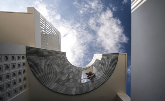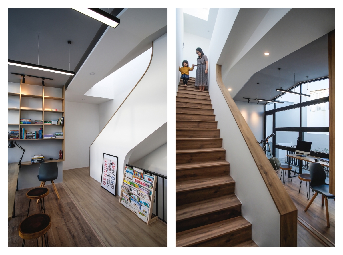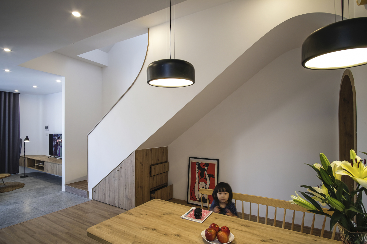 Đường cong của không gian nội thất đồng bộ với mặt tiền nhà đồng thời thêm sự thú vị cho một công trình có trẻ nhỏ.