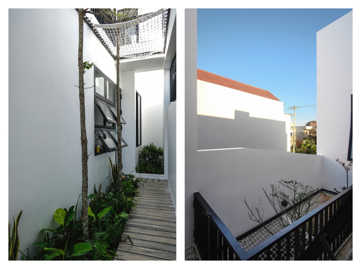 Bên hông nhà, khoảng sân kết hợp giếng trời tạo khoảng thoáng cho căn nhà ba mặt giáp nhà hàng xóm.