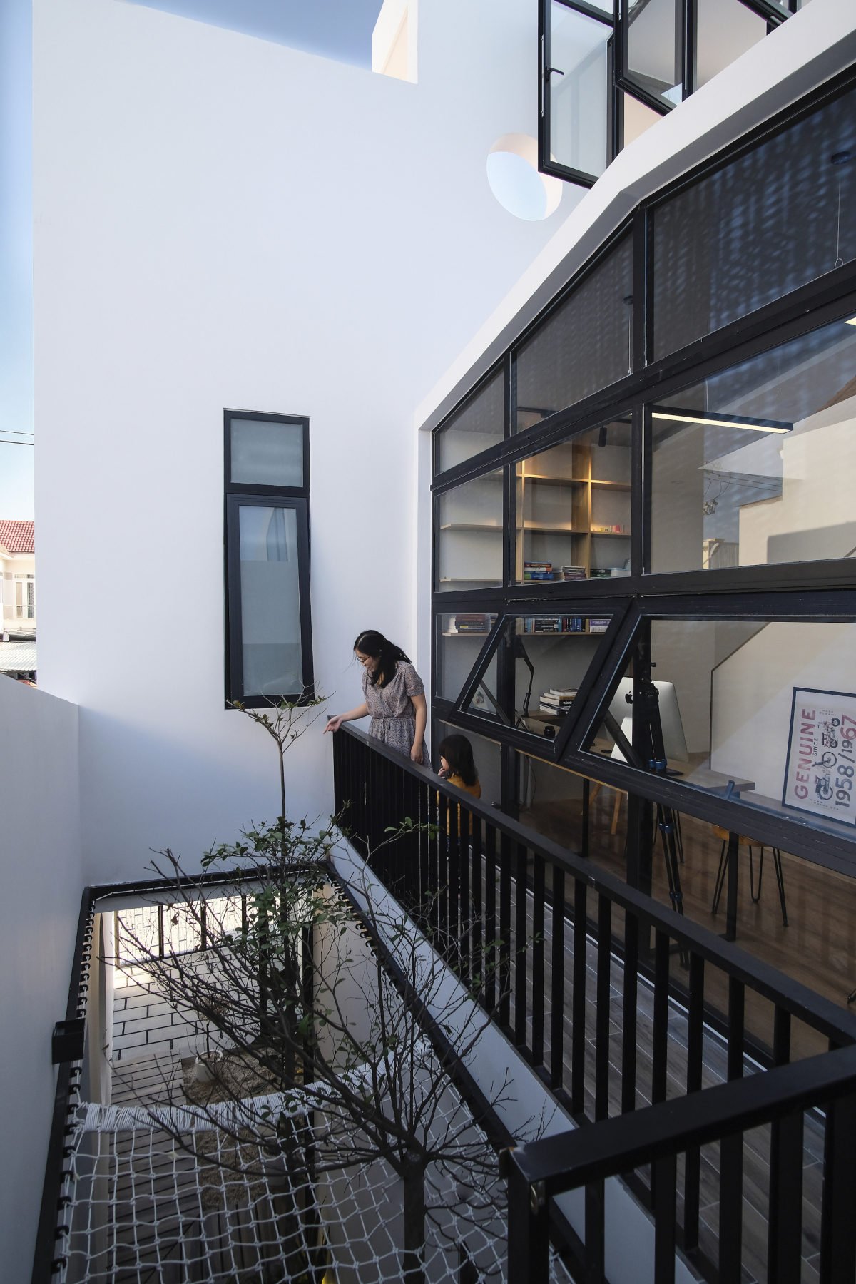 Mảng kính lớn ôm trọn giếng trời giúp phòng làm việc tận dụng tối đa ánh sáng và gió tự nhiên. Từ phòng làm việc, người ở cũng dễ dàng kết nối với không gian bên dưới.