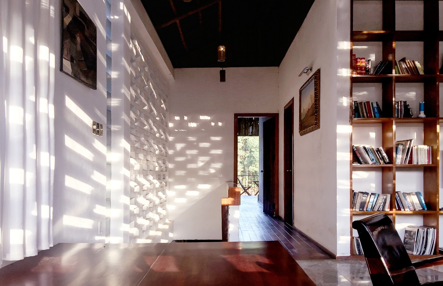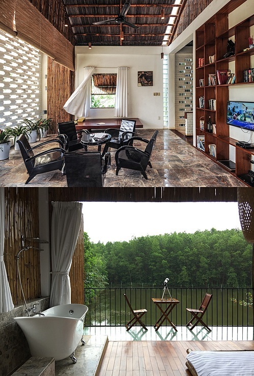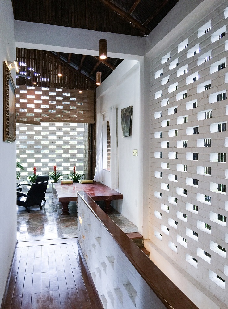 Tầng hai có lối vào riêng nhờ đồi cỏ ở hông nhà. Bước lên hết đồi cỏ, qua một mái hiên tre là tới phòng khách. Lớp gạch ở phòng khách giúp thông gió, lấy nắng cho công trình.