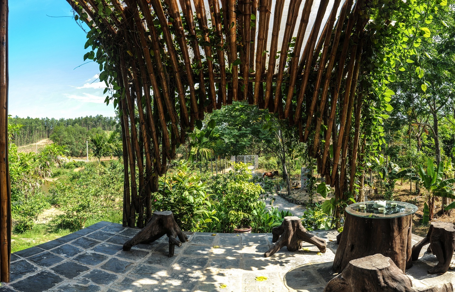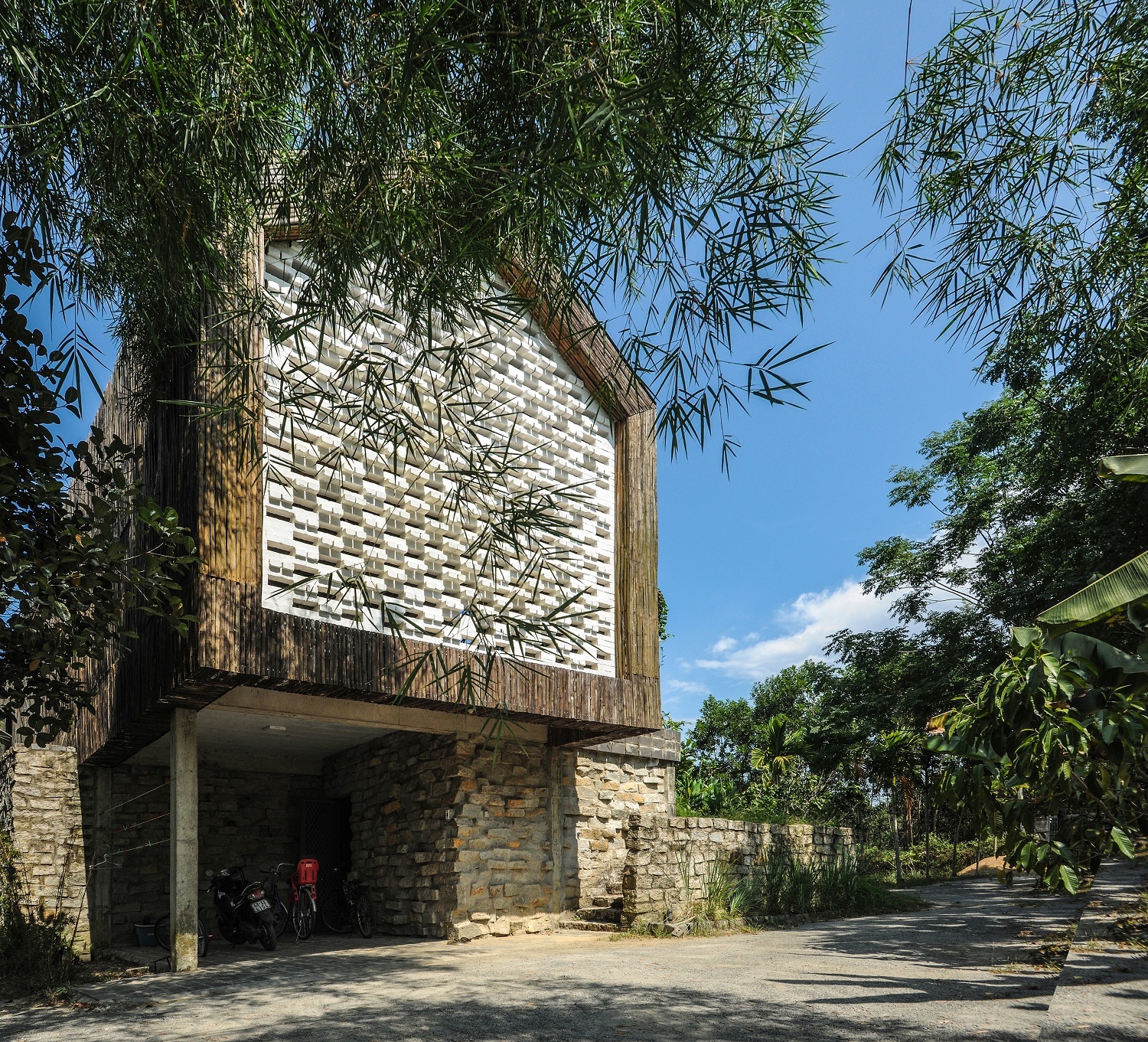 Tầng hai được bao bởi phần từ vỏ thân tre tươi. Lớp vỏ này gồm hai lớp thân tre trong và ngoài, ở giữa là lớp chống thấm. Nhờ không khí lưu thông giữa các lớp vỏ, bên trong nhà mát mẻ hơn. Lớp vỏ cũng có chức năng che chắn cho công trình tránh khỏi các yếu tố khí hậu nhiệt đới và tạo nên diện mạo đặc biệt.