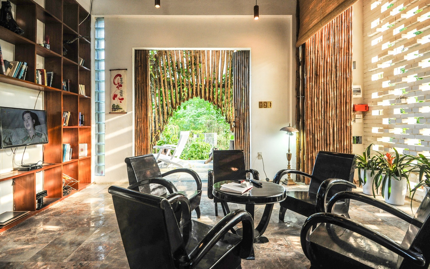 - Không cửa sổ nhôm kính: Thay vào đó là hệ thống cửa gập bằng phên liếp tre, cho phép lấy sáng và lấy gió tự nhiên. Hệ thống cửa này giúp nhà có thiết kế mở mà vẫn giữ được sự riêng tư và đảm bảo an toàn khi gia chủ không ở đây.