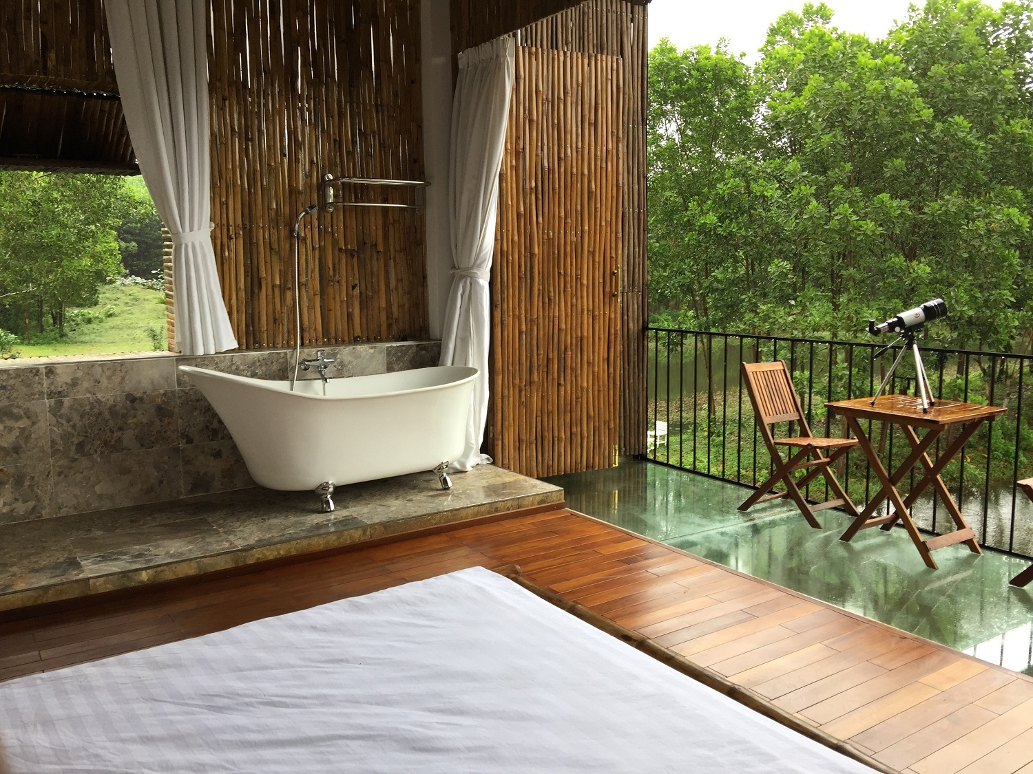 Hai phòng ngủ nối tiếp nhau mang phong cách vùng quê Việt Nam. Phòng ngủ master có thiết kế mở hoàn toàn ở phía trước, tiếp xúc trực tiếp với thiên nhiên. Nhờ dầm vượt nhịp lớn, sàn phòng ngủ vươn ra 4,5 m mà không cần hệ cột chống đỡ, vừa vặn che chắn cho không gian ăn uống kết hợp vọng cảnh ngoài trời ở bên dưới. Sàn ban công có đoạn làm bằng kính cường lực, tạo cảm giác như đang trôi giữa mặt hồ.