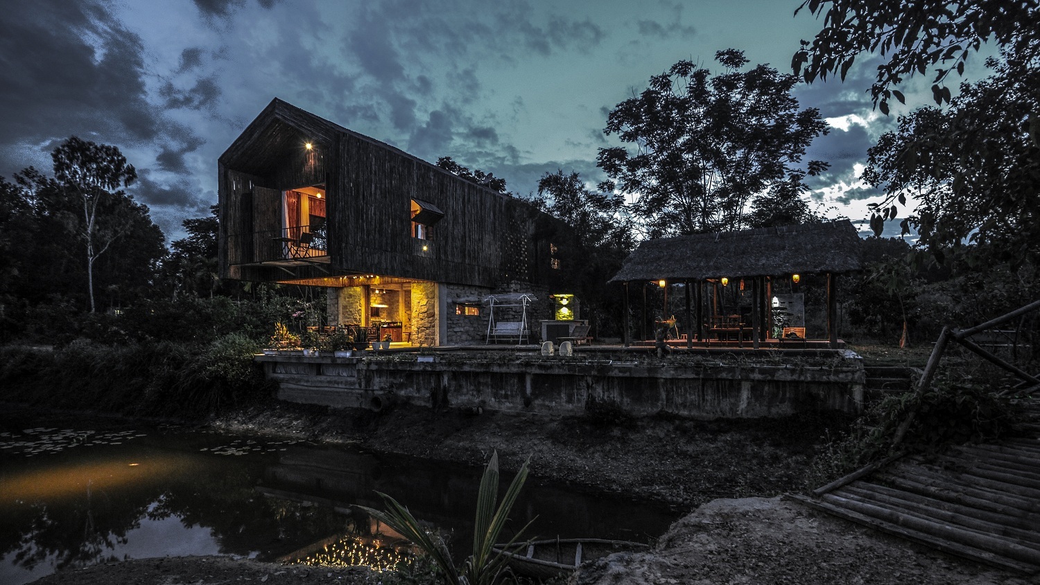 Hình khối nhà được thiết kế để đón gió từ các phía và vươn ra mặt hồ. Nhà có hai tầng, trong đó tầng trệt làm từ đá hộc địa phương, đóng vai trò là khối trụ đỡ tầng hai phía trên.