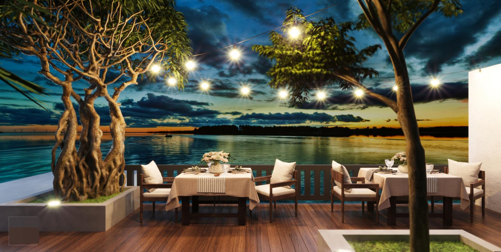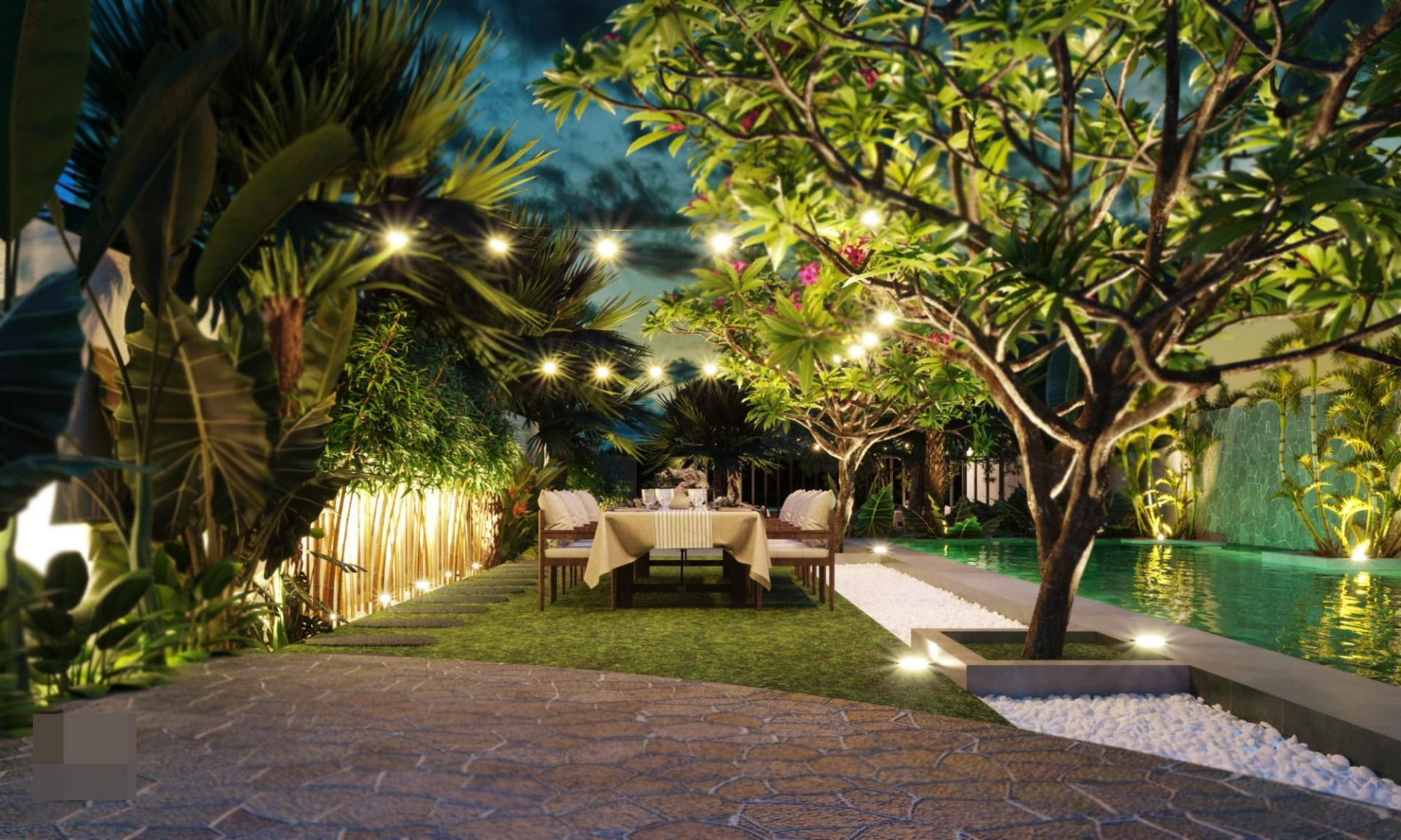 Một phần lối đi lát đá rối giống tường bên bể bơi, phía trong trồng thảm cỏ êm ái, xanh rì. Sự kết hợp của ánh đèn bên bụi trúc và trên các cành cây cho không gian thêm lung linh vào buổi tối.