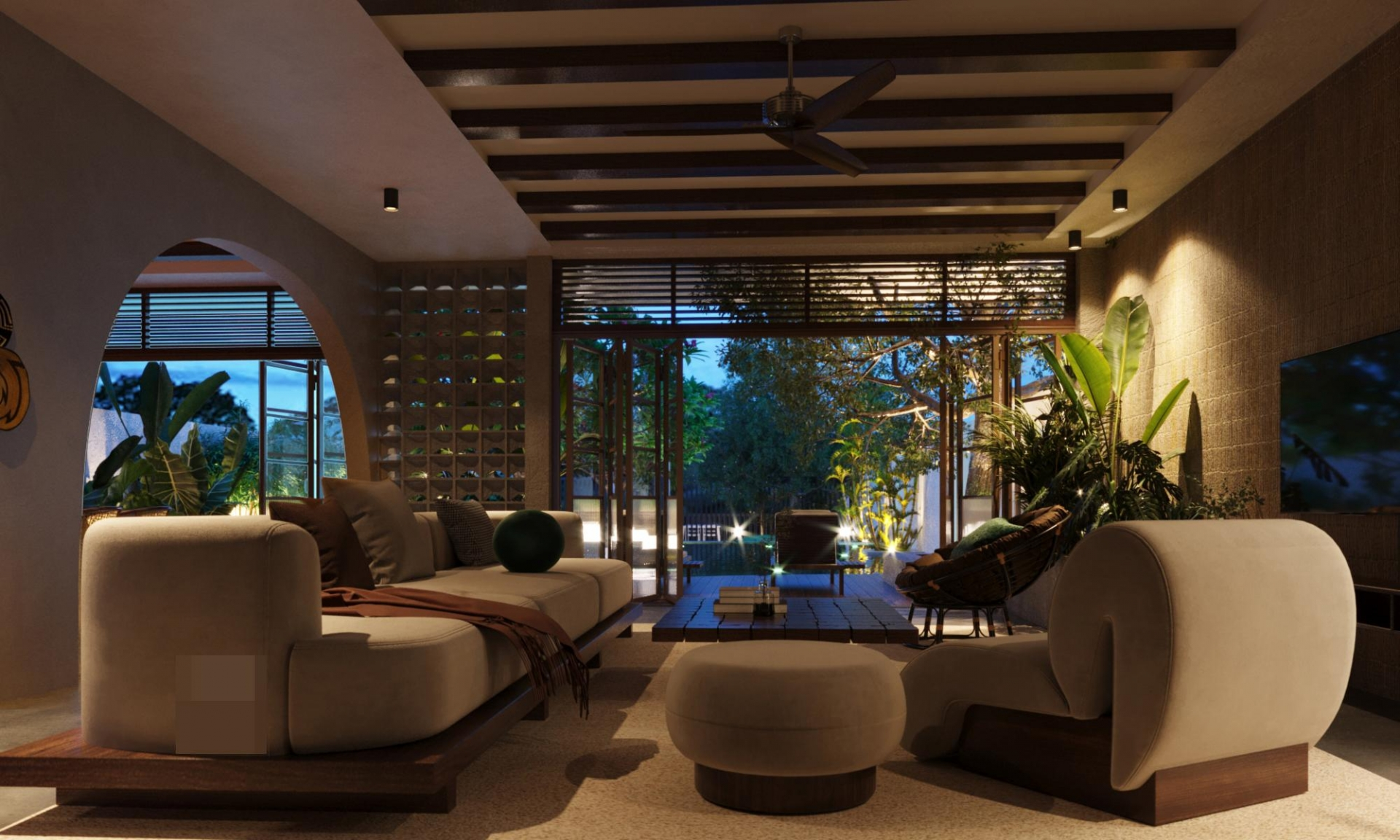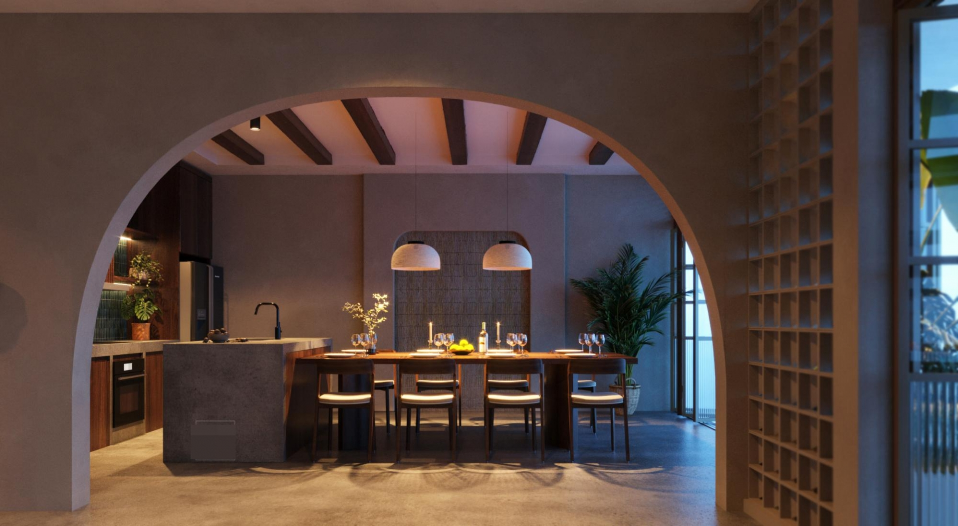 Phòng khách và bếp kết nối thông qua cửa vòm.