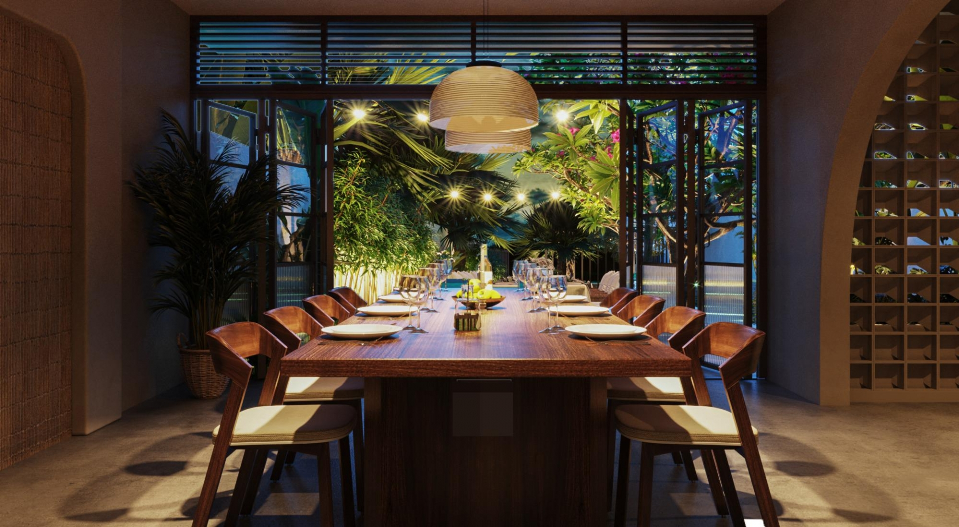 Bàn ăn trong nhà bằng gỗ với kích thước lớn, phục vụ tối đa 10 người.