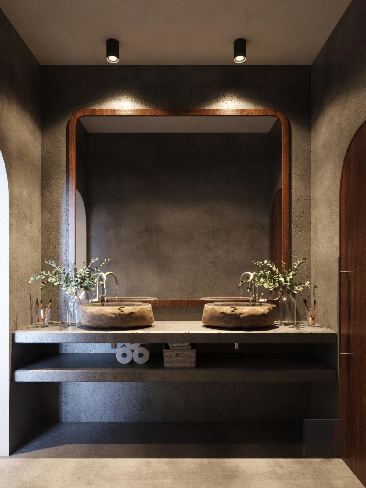 Phòng tắm mang đúng chất mộc có bồn rửa bằng đá mài, tường tạo hiệu ứng bê-tông xưa.
