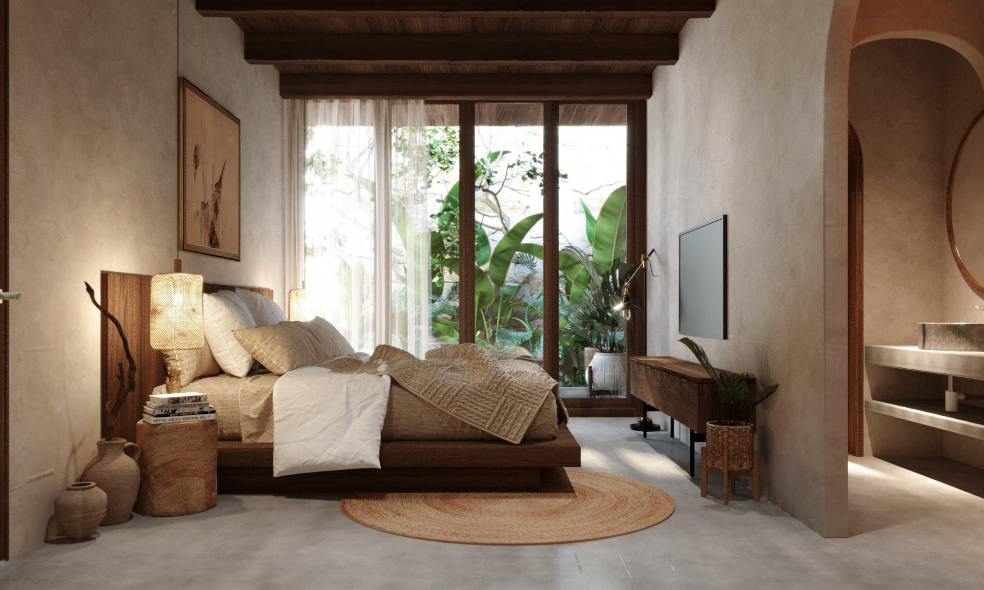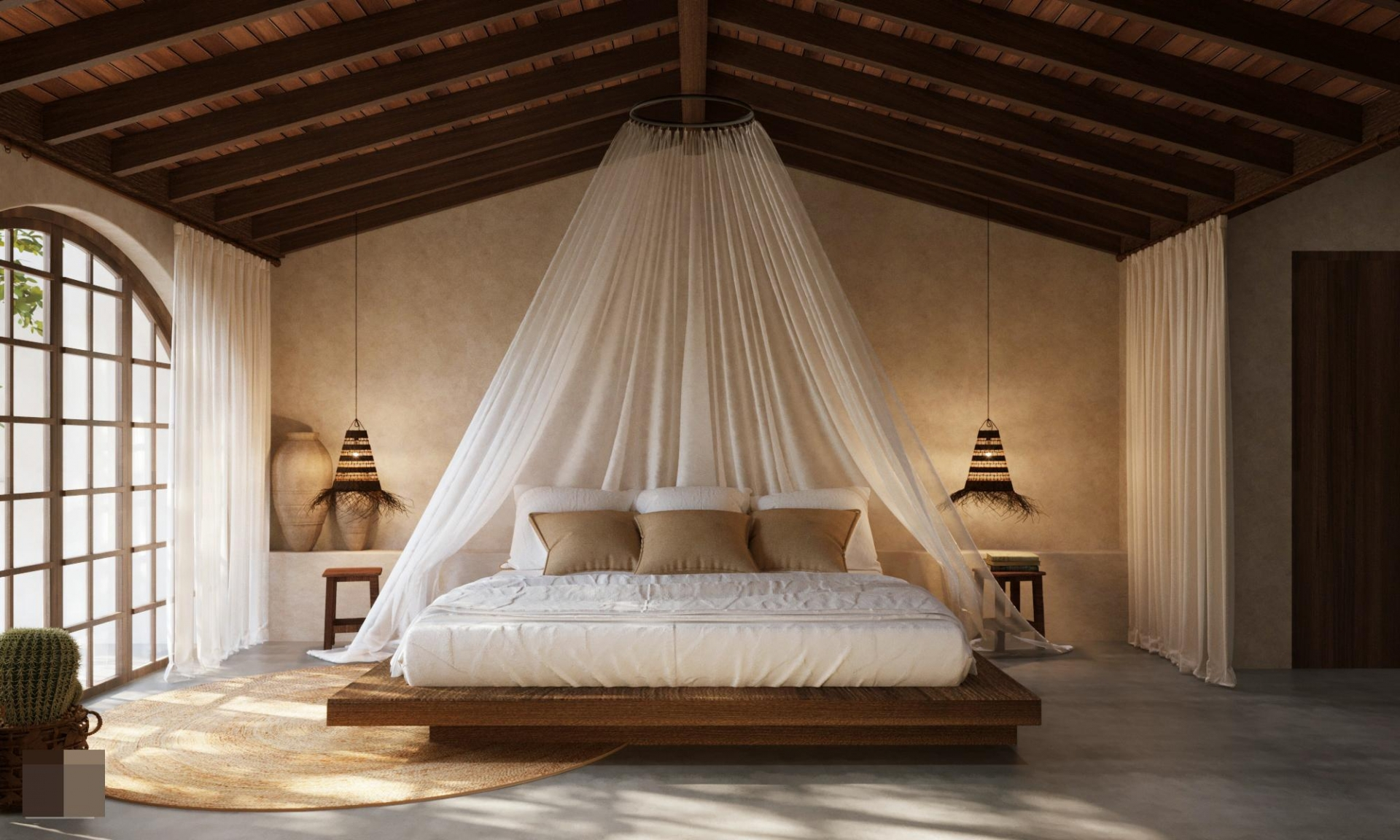 Phòng ngủ chan hòa ánh sáng, gió trời qua khung cửa vòm lãng mạn như ở bãi biển.