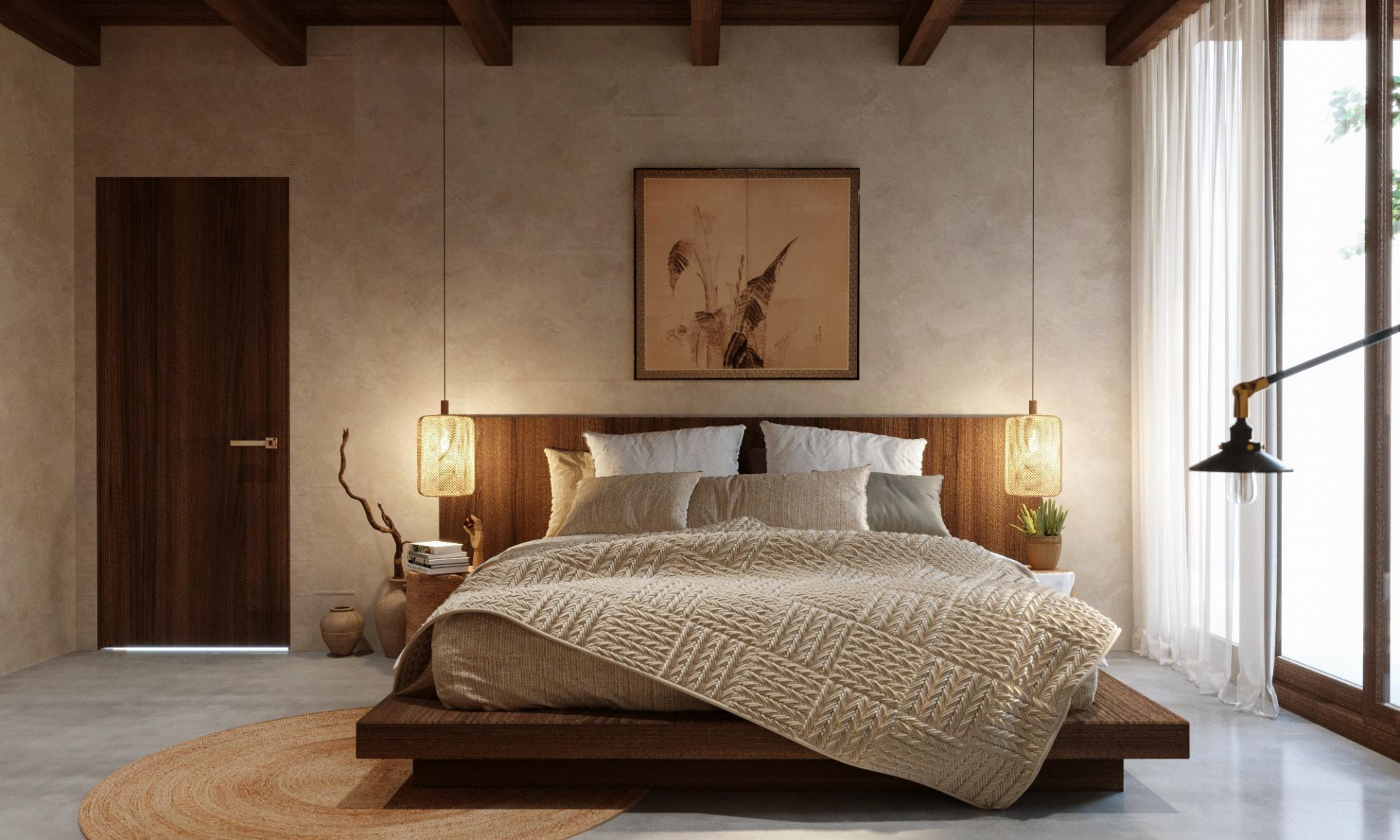 Vào ban ngày, ánh sáng luôn tràn ngập khắp phòng. Buổi tối chỉ cần bật hai chiếc đèn ngủ đầu giường là có cảm giác dễ chịu, vừa đủ sáng mà không bị chói gắt.
