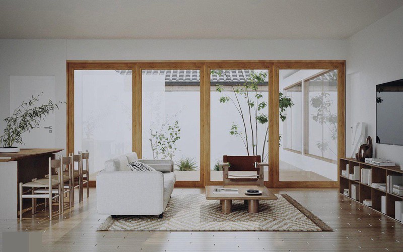 Phòng khách theo tiêu chí đơn giản. Khung cửa trượt gợi nhớ đến ngôi nhà của nhân vật Nobita trong phim hoạt hình nổi tiếng Doraemon.