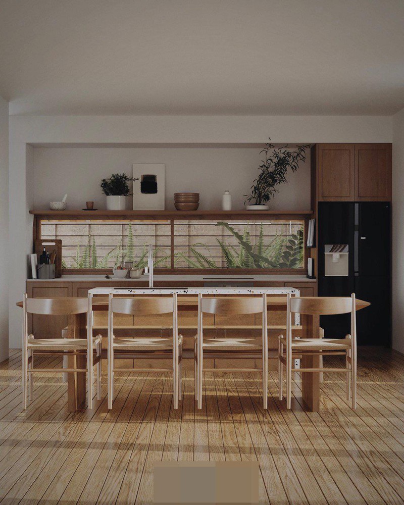 Nội thất với tông màu chủ đạo là gỗ và trắng mang đến sự ấm áp mộc mạc và trong trẻo, điểm một chút màu xanh pastel nhẹ nhàng làm không gian nội thất nhìn mát mẻ.