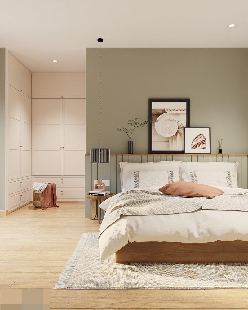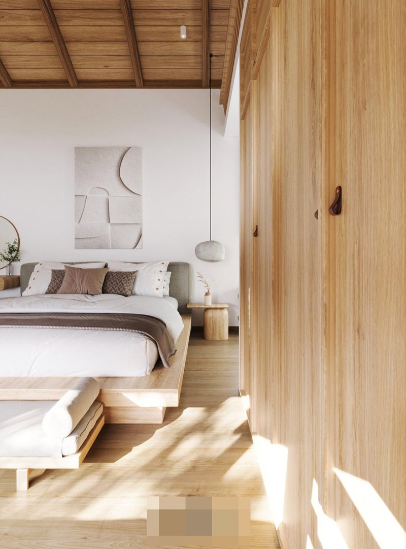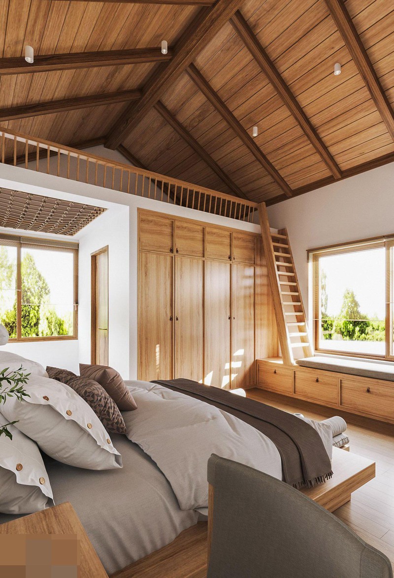Hai phòng ngủ ở tầng 1 và tầng 2. Hệ thống tường lấy màu trắng hoặc màu trắng gạo làm chủ đạo, thêm chút màu xanh nhấn nhá. Sàn nhà và đồ dùng trong nhà giữ nguyên màu gỗ tự nhiên.