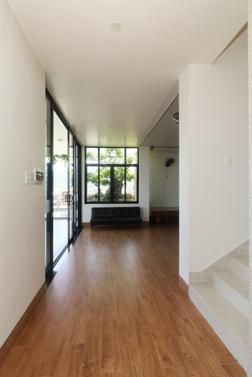 Khu đất có diện tích khá lớn nhưng lại có mặt tiền hẹp. Công trình trải dài theo hướng bắc-nam với mặt đón nắng chính đông - tây, kiến trúc sư Trương Minh Tùng (Chi.Arch) đã tổ chức không gian mặt ngoài nhà thành hai lớp với những khoảng ban công và hiên rộng.