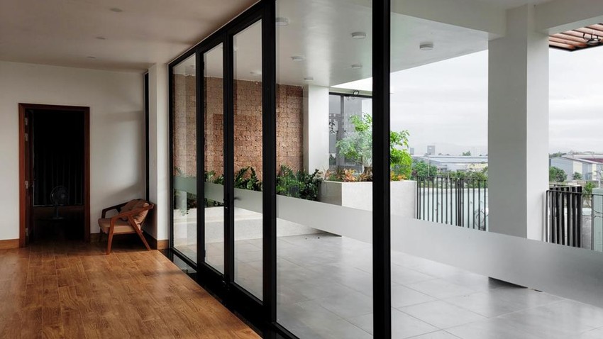 Mặt hướng tây được bố trí các chức năng phụ như vệ sinh, cầu thang, các gian sinh hoạt như phòng gym, phòng học trẻ em được tách biệt bởi ban công cây xanh và hệ tường gạch hoa gió.